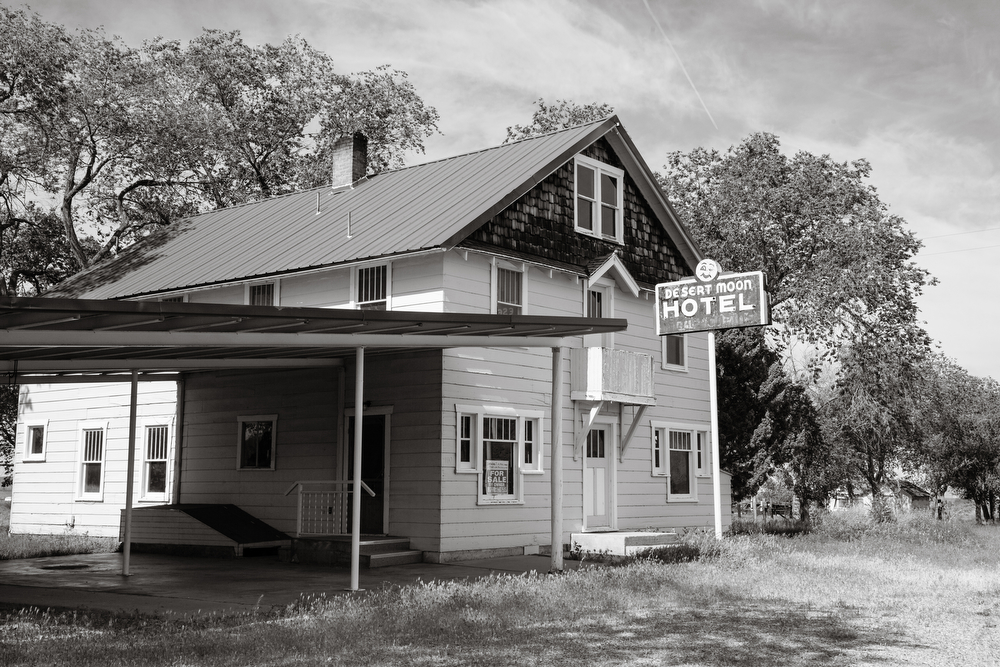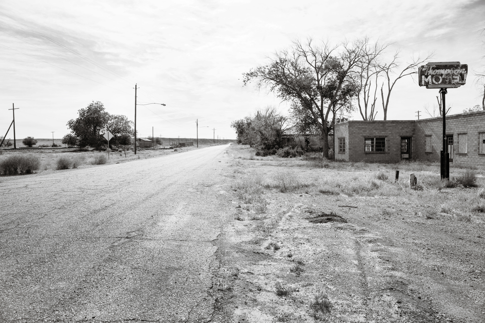 A motel stands at the town crossroads, a sign of the passenger trains that shared the line with the big freight cars.