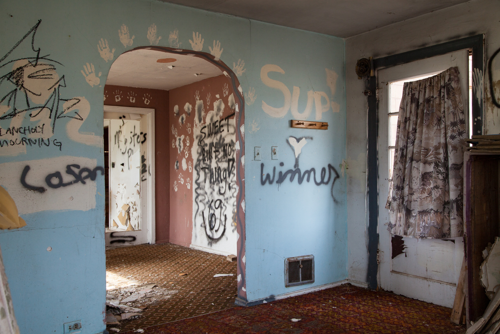 A short stretch off the interstate, a four-way stop marks the center of the city. Many of the buildings in the vicinity have been abandoned. Most that have not are in disrepair. An old depot still stands beside active tracks where trains rush magnificently through the city a few yards from the crossroads.