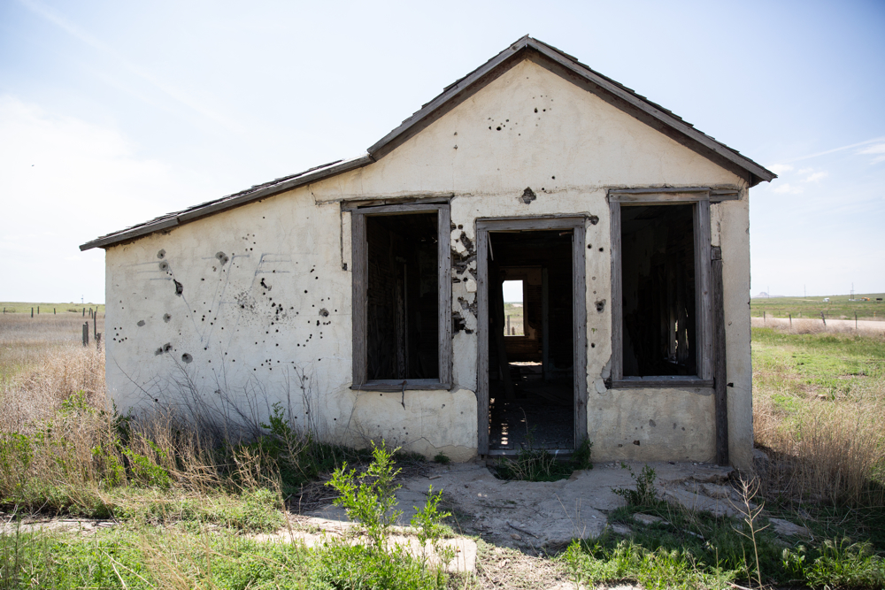 This little guy sits at the intersection of two dirt roads just north of Raymer, CO in the Pawnee Grasslands preserve. I don’t think there’s any big story around it, or at least none we could find. It sure was pretty, though, in a falling-apart sorta way.
